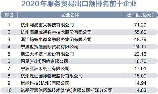 值得高兴的是,浙江服贸找到了自己新的增长点——去年4月,在计算机信息、通信服务等数字贸易带动下,浙江服务贸易率先回正。浙江数字服贸的老牌劲旅浙大网新集团在逆境中充分展示了自身的竞争优势。“疫情严重冲击国际货物贸易,却难以阻隔线上服务。”浙大网新副总裁、网新恒天CEO周波介绍说,去年他们完成了不少服贸大单,为一家金融科技巨头并购海外支付公司提供系统集成技术支持,还为“顾家家居”等出海企业提供自主研发的金融自动化解决方案。