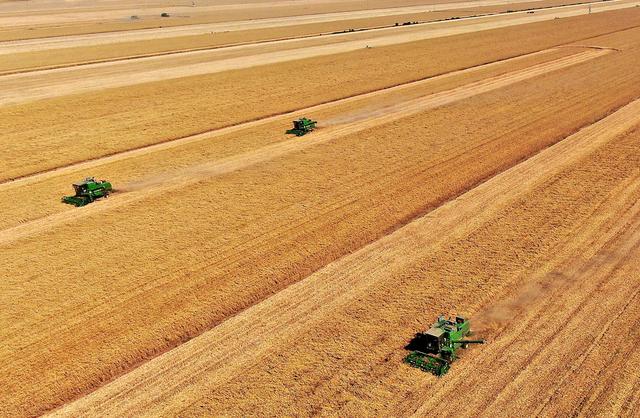 在河南省黄泛区农场九分场的麦田里,农机手操作收割机收获小麦(无人机照片,2021年6月6日摄)。新华社记者 李安 摄