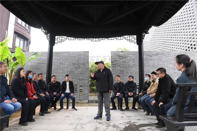 2021年4月11日,浙江诸暨枫桥镇魏廉村老党员魏杏根(中)在枫桥经验陈列馆的亭子内和年轻党员分享当年运用“枫桥经验”化解基层矛盾的故事。新华社记者 翁忻旸 摄